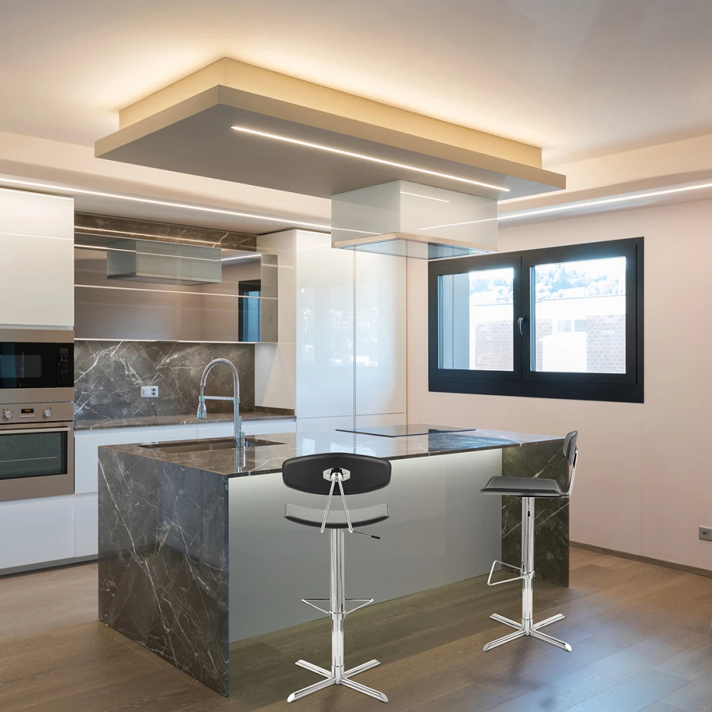 Mit seinem mondän schicken Design wird der Barhocker Blade Ihre Küche zum Strahlen bringen. Er steht in schwarzem Lederfaserstoff zur Verfügung. Der solide Sockel mit vier Füßen bietet eine optimale Stabilität und ist ebenfalls verchromt. Der Blade ist ebenso stufenlos höhenverstellbar wie drehbar. Ihr Fußboden wird mit Unterbodenschonern vor Kratzern geschützt.