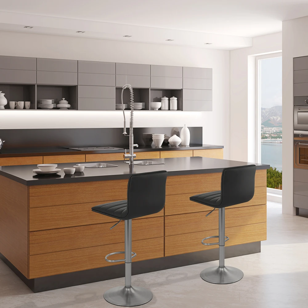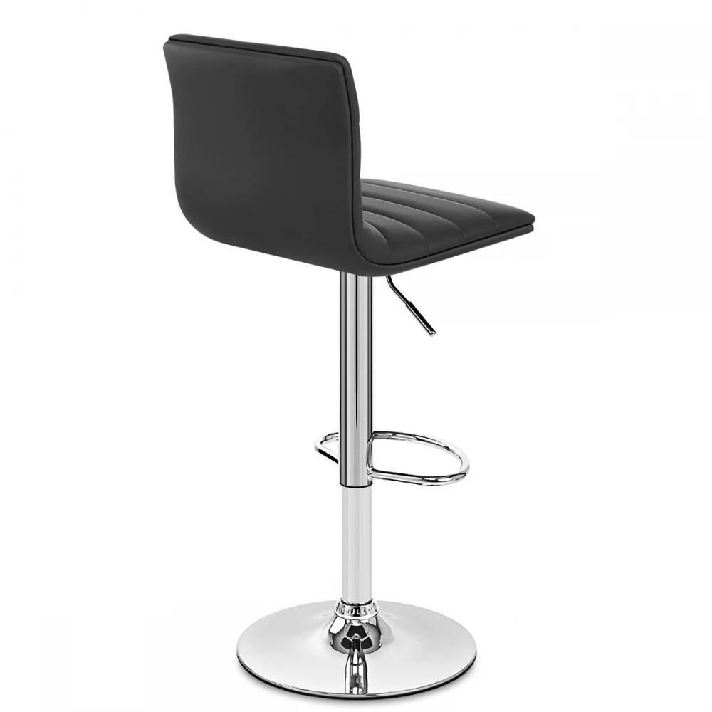 Der Barhocker Linear ist ein moderner Stuhl. Sein Sitz ist gepolstert und überzogen mit Kunstleder sehr guter Qualität. Ein einfaches feuchtes Tuch reicht aus, um dieses Material zu reinigen. Sein Untergestell ist aus poliertem Chrom. Er verfügt zudem über eine Fußstütze und einen Zylinder und ist deshalb höhenverstellbar und kann um 360° drehen. Schließlich sind auch noch Gummis vorhanden, die Ihren Boden schützen.