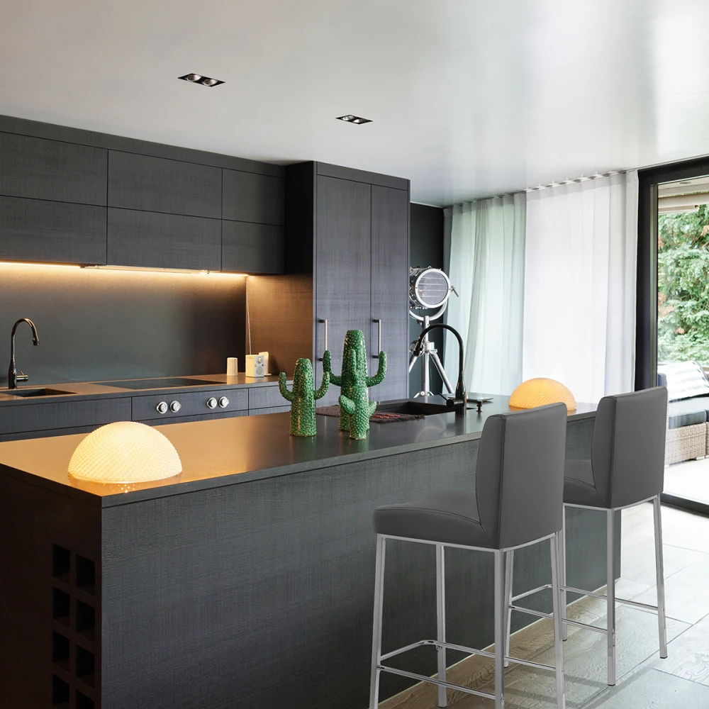 Gönnen Sie sich den Komfort und die Ästhetik des Barhockers Pacino. Sein Sitz und seine hohe Rückenlehne sind üppig gepolstert und mit einem wunderbaren Kunstleder verkleidet. Die Fußstütze, das Untergestell sowie der Fuß sind aus poliertem Chrom. Natürlich hat auch der Pacino Barhocker Gumminoppen die zum Schutz ihres Boden dienen.