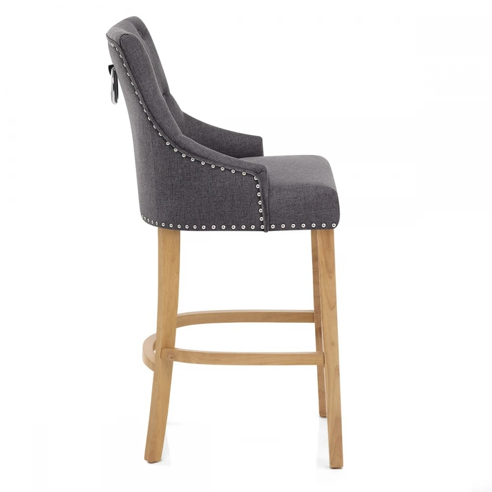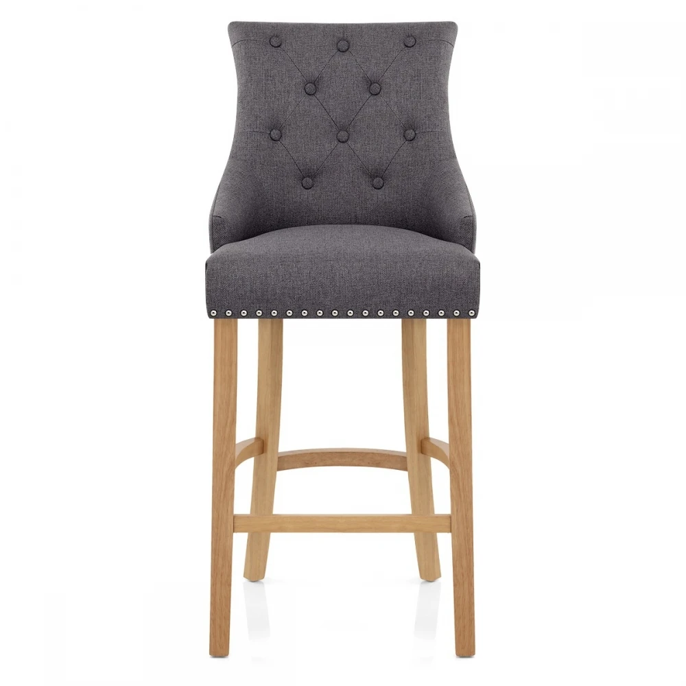 Der Ascot Stoff barhocker Eiche ist ein sehr beliebtes und exklusives Design und verleiht Ihren Küchen- oder Frühstücksbereich einen Hauch von Klasse. Der Stoffsitz ist geschmackvoll mit Chrom-Nieten an der Sitz- und Rückenkante verziert und verfügt über einen stabilen Rahmen für zusätzlichen Komfort. Die hohe stützende Rückenlehne ist mit Knopfdetail sowie einen schicken Chromring auf der Rückseite geschmückt. Einen starken Rahmen bilden die vier massiven Holzbeine, die durch Verstrebungen und eine handliche Fußstütze verbunden sind. Zusätzlich verfügt jedes Bein über einen schützenden Bodenstopfen an der Unterseite.