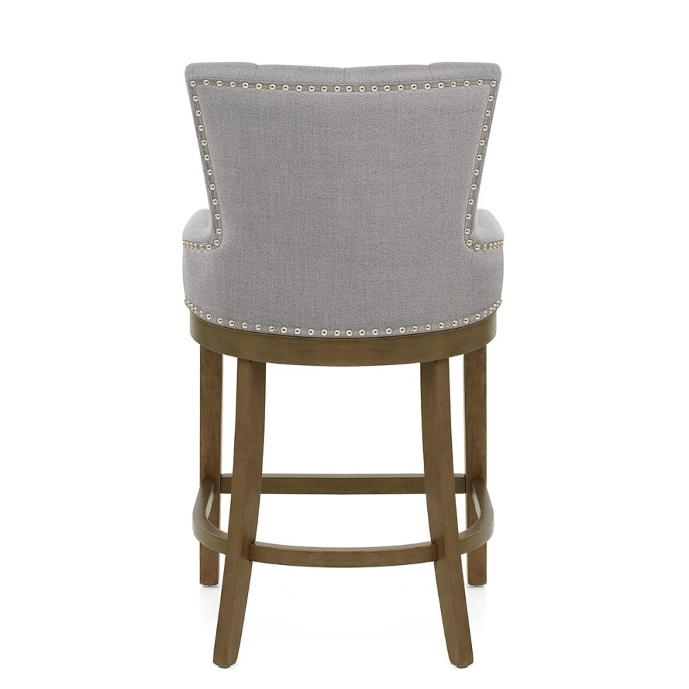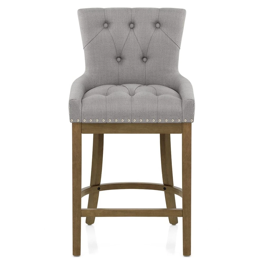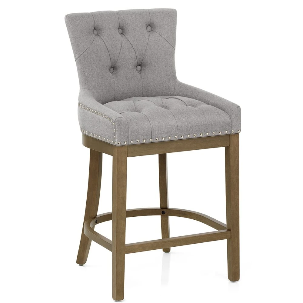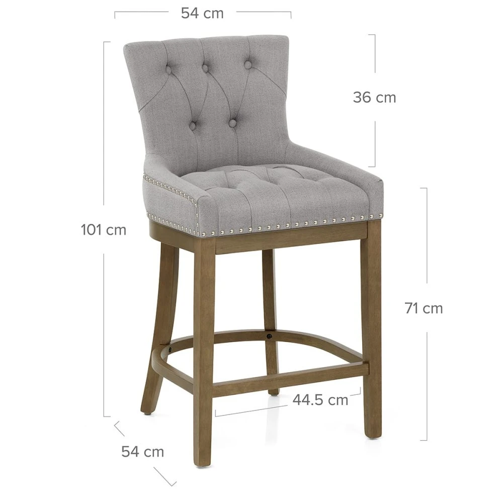 Der Stoffbarhocker in Eiche strahlt einen exquisiten Stil und Substanz aus und bringt Eleganz in die Küche. Der Sitz hat einen Gürtelrahmen, um einen hohen Komfort zu gewährleisten, und ist mit trendigem Stoff bezogen. Das luxuriöse Aussehen wird durch die tiefe Knopfleiste an der hohen Rückenlehne und Sitzfläche unterstrichen. Die hohe Rückenlehne umschließt den Sitz für ein umfassendes Gefühl. Der klassische Rahmen aus massivem Holz hat ein antikes Eichenholzdekor und wird durch Streben zwischen den vier Beinen verstärkt. Eine vordere Fußstütze und Schutzpolster unter den Beinen sind tolle praktische Eigenschaften.