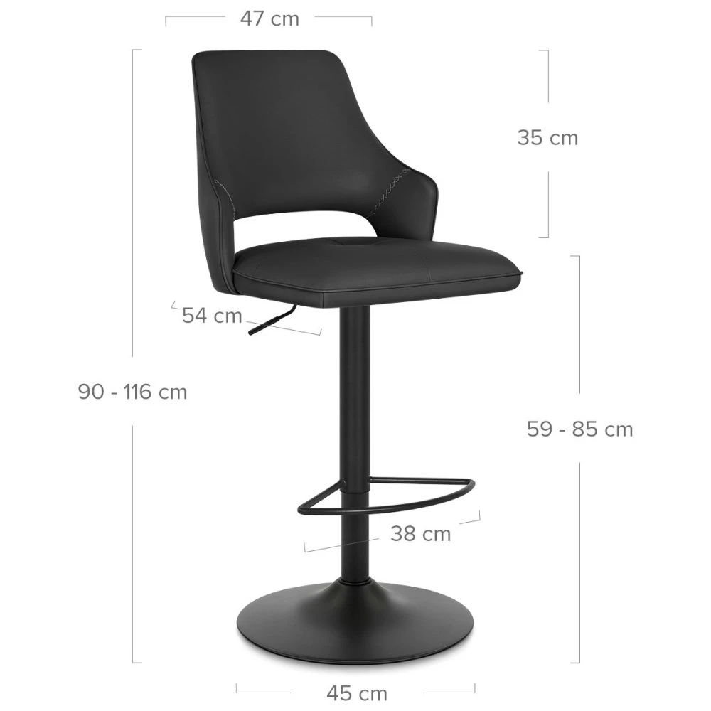 Der Iona Barhocker vereint modernes Aussehen und hohen Komfort in einem stilvollen Design. Lehnen Sie sich zufrieden zurück und freuen Sie sich über die bewundernden Kommentare Ihrer Gäste. Das geschwungene Design ist eine moderne Variante des traditionellen L-förmigen Sitzes und besteht aus einer hohen Rückenlehne, die sanft in geschwungene Seiten übergeht. Der Sitz ist gut gepolstert und mit einem pflegeleichten Kunstlederbezug versehen. Die Sitzfläche verfügt über eine umlaufende Paspelierung und zwei Linien mit Kreuzstich, die bis über die Flügel verlaufen. Das 360-Grad-Design und die Höhenverstellbarkeit machen diesen Barhocker praktisch unverzichtbar. Das Gestell ist mit einer schwarzen, satinierten Pulverbeschichtung versehen, die mit der Sitzfläche harmoniert, und verfügt über eine robuste, gewölbte Fußstütze sowie einen Bodenschutz, um Kratzern vorzubeugen.
