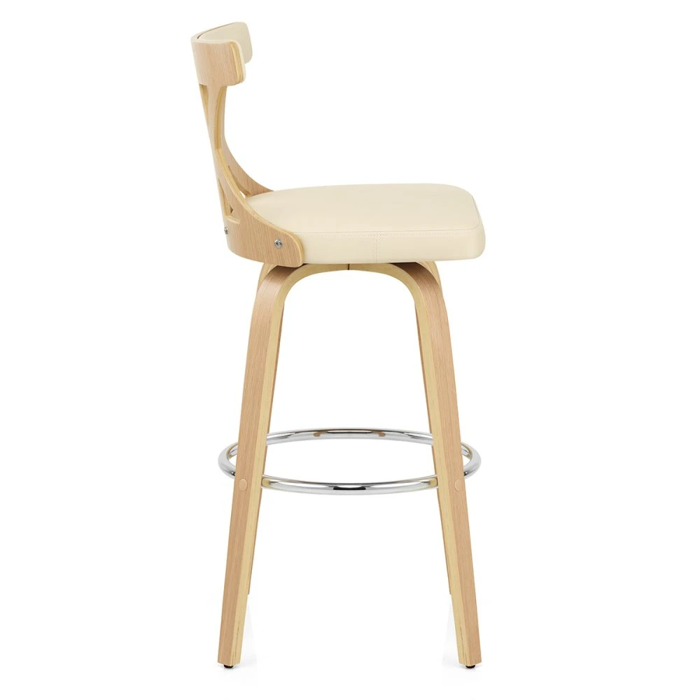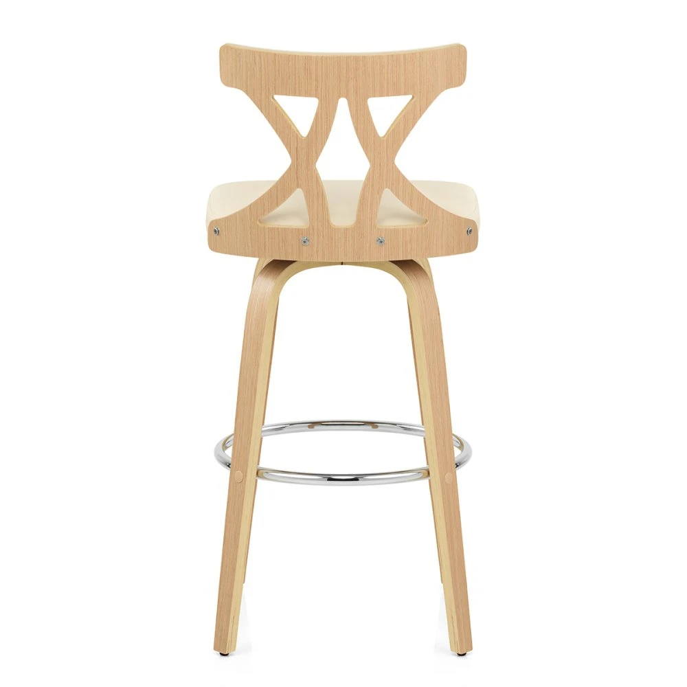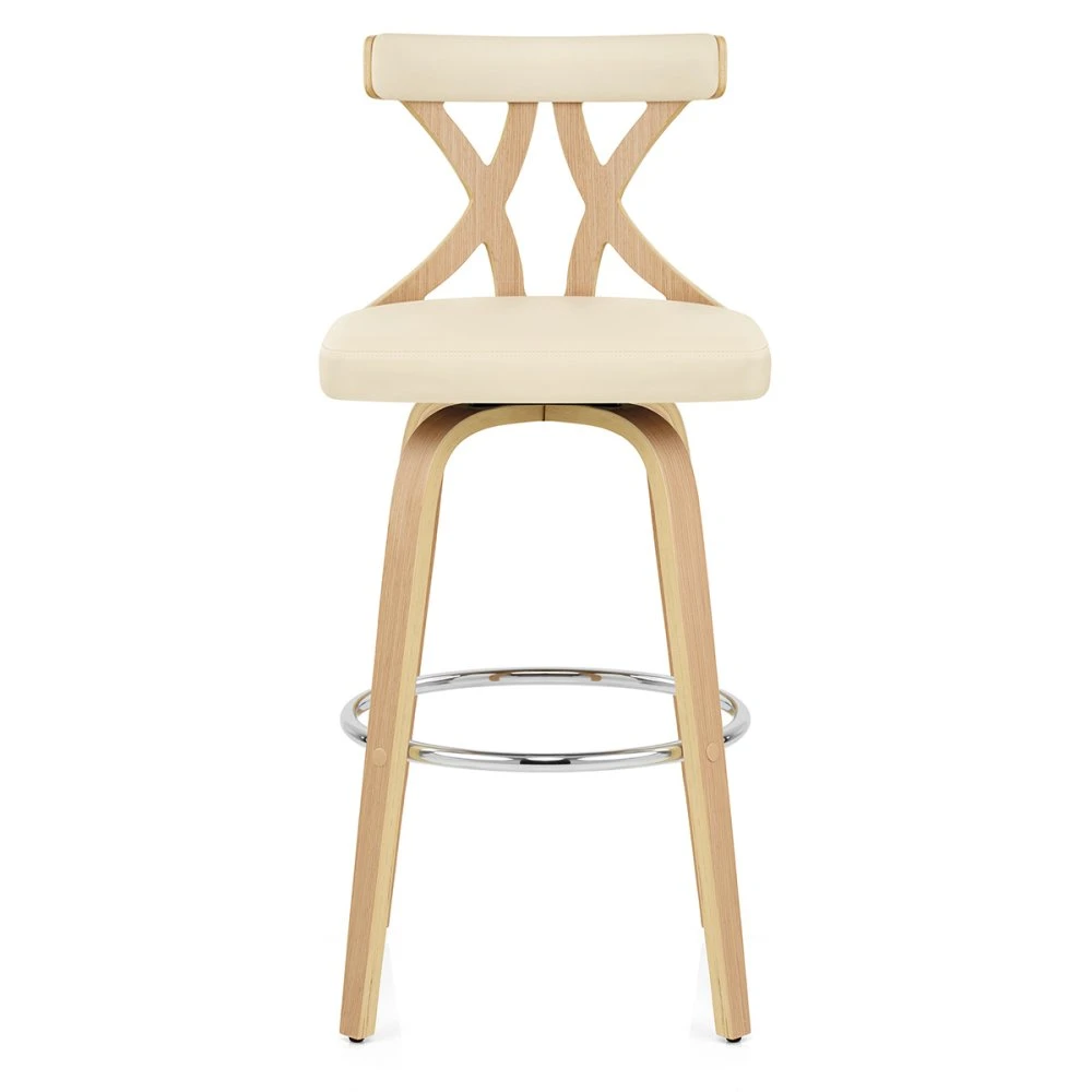 Der Nash Barhocker mit Kunstleder-Bezug ist darauf ausgelegt, über Jahre hinweg ein Blickfang und eine auffällige Ergänzung in Ihrem Raum zu sein. Mit seiner weichen, leichten Ästhetik passt er perfekt zu Ihrer Küchenarbeitsplatte und ergänzt das umliegende Dekor. Der stützend gepolsterte Sitz mit abgerundeten Ecken ist mit hochwertigem Kunstleder bezogen, das für Komfort und Stil sorgt. Die markante Rückenlehne besteht aus sich kreuzenden Bugholzlinien, die in der Mitte einen Rautenausschnitt bilden. Diese Linien verlaufen um das Sitzpolster herum und gehen in ein erhöhtes, gepolstertes Rückensegment über, das ebenfalls mit Kunstleder bezogen ist und zusätzlichen Komfort bietet. Am oberen Ende des Rahmens befindet sich eine Drehplatte, die eine 360-Grad-Drehung des Sitzes ermöglicht. Vier glänzende Bugholz-Beine, die durch eine runde, verchromte Fußstütze miteinander verbunden sind, sorgen für Stabilität und Eleganz. Die verchromte Fußstütze ist nicht nur praktisch, sondern erhöht auch die Standfestigkeit der Beine. Am Ende jedes Beins befindet sich ein verstellbarer Bodenstopfen, der Ihren Boden schützt und Unebenheiten ausgleicht.