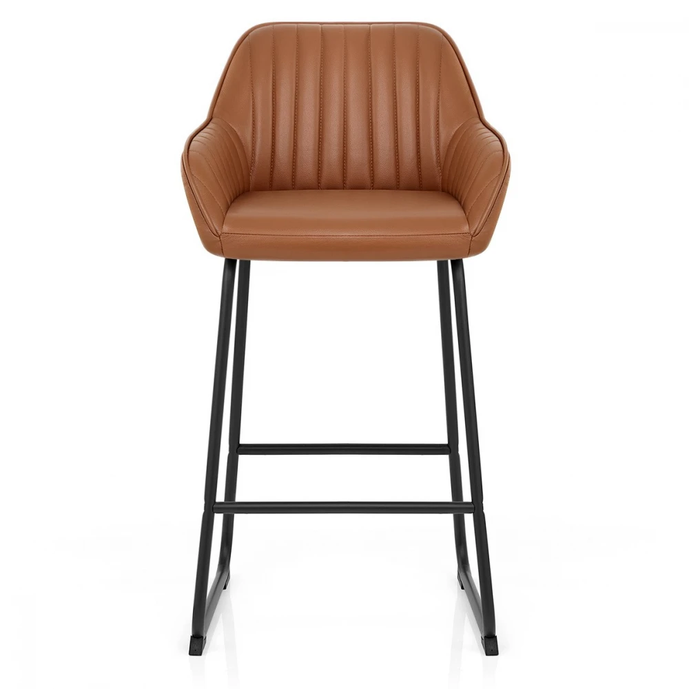 Der Kanto Barhocker besitzt ein sicheres Stilgefühl, welches ein Statement in jedem Heim setzt. Geneigte Armteile sind mit vertikalen Nahtlinien gemustert und stimmen sich mit der inneren Rückenlehne ab, was zu einer angenehmen Retro-Ästhetik führt. Das glatte Sitzpolster ist gepolstert und mit luxuriösem Echtleder überzogen. Das stabiles Gestell umfasst gebogene Beinteile, die durch massive Metallstangen an der Vorder- und Rückseite des Hockers verstrebt und verbunden sind. Ein schwarzes rundet das Gestell ab. Ein Bodenschutz ist unter den Gestellbeinteilen angebracht.