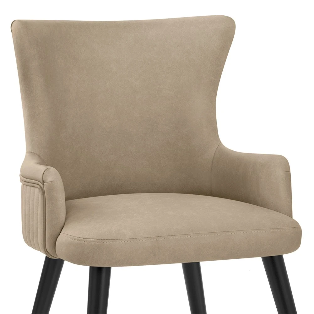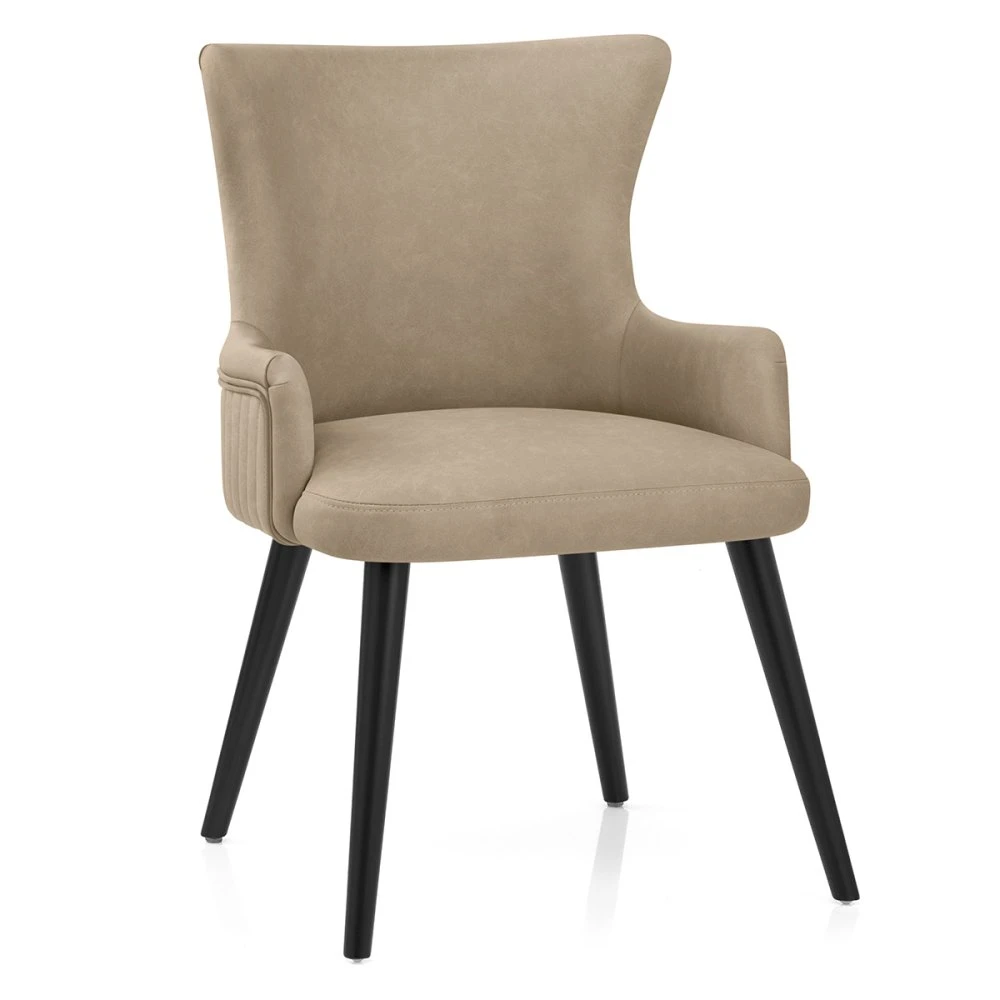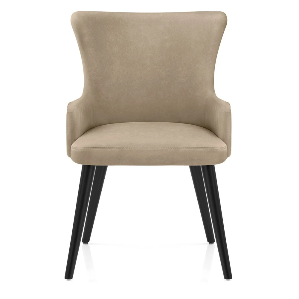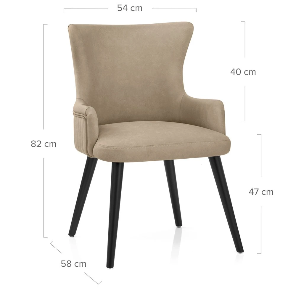 Der Diablo Esszimmerstuhl ist ein absoluter Blickfang und stellt eine luxuriöse Variante eines traditionellen Stuhls dar. Ob am Esstisch, in der Küche oder als gelegentlicher Ecksessel, mit diesem Möbelstück sitzen Ihre Gäste jederzeit bequem. Der moderne Stuhl mit Kunstleder-Rückenlehne ist durchgehend gepolstert und an der Außenseite mit eleganten vertikalen Nähten versehen. Eine Paspelierung entlang des Randes rundet den eleganten Look ab. Der Sitz wird von einem Massivholz-Rahmen in schlichtem Schwarz getragen. Das Gestell besteht aus vier rohrförmigen Beinen, die auf Standard-Esshöhe fixiert sind und nach unten in schützende, verstellbare Füße übergehen, die perfekt für unebene Böden geeignet sind und Kratzern vorbeugen.