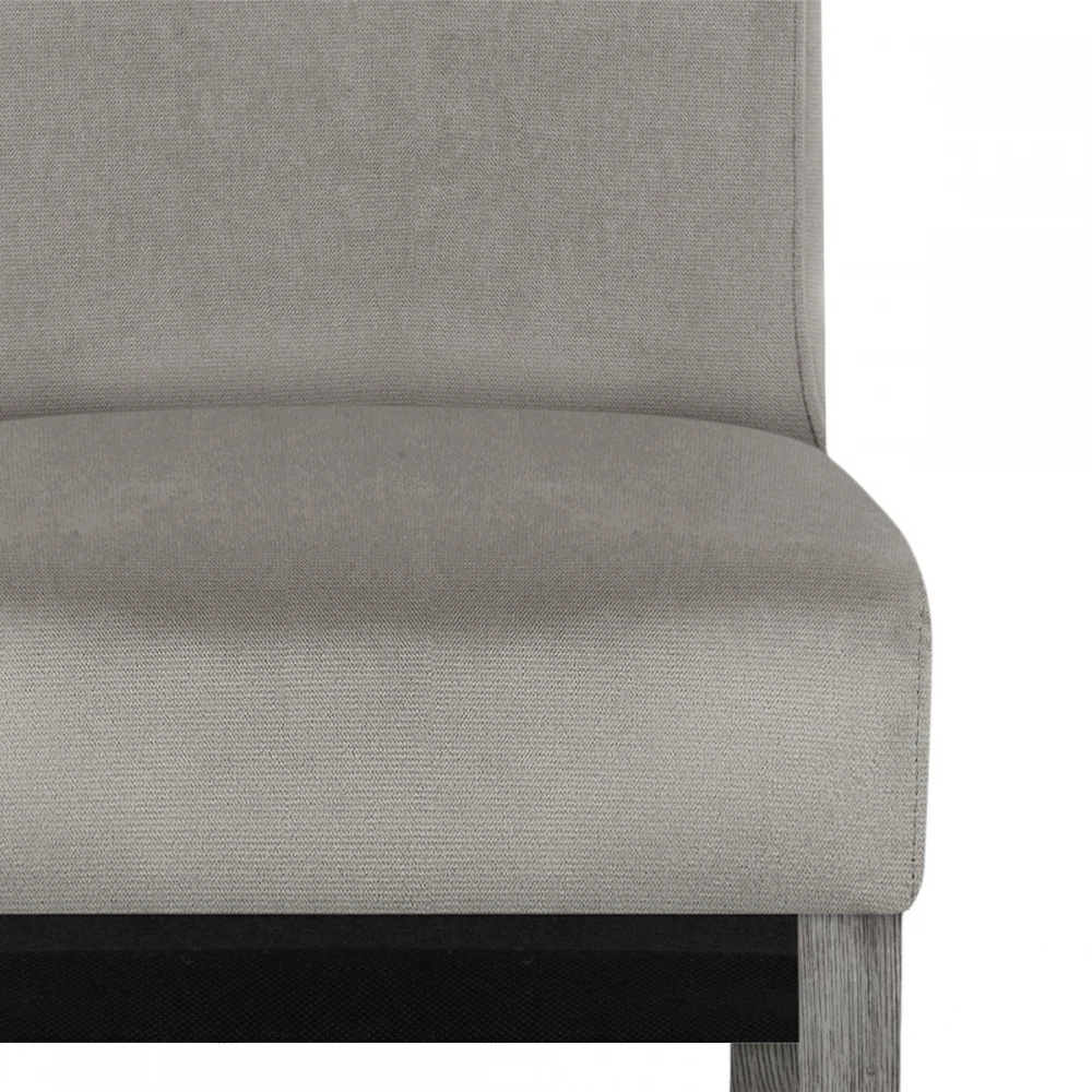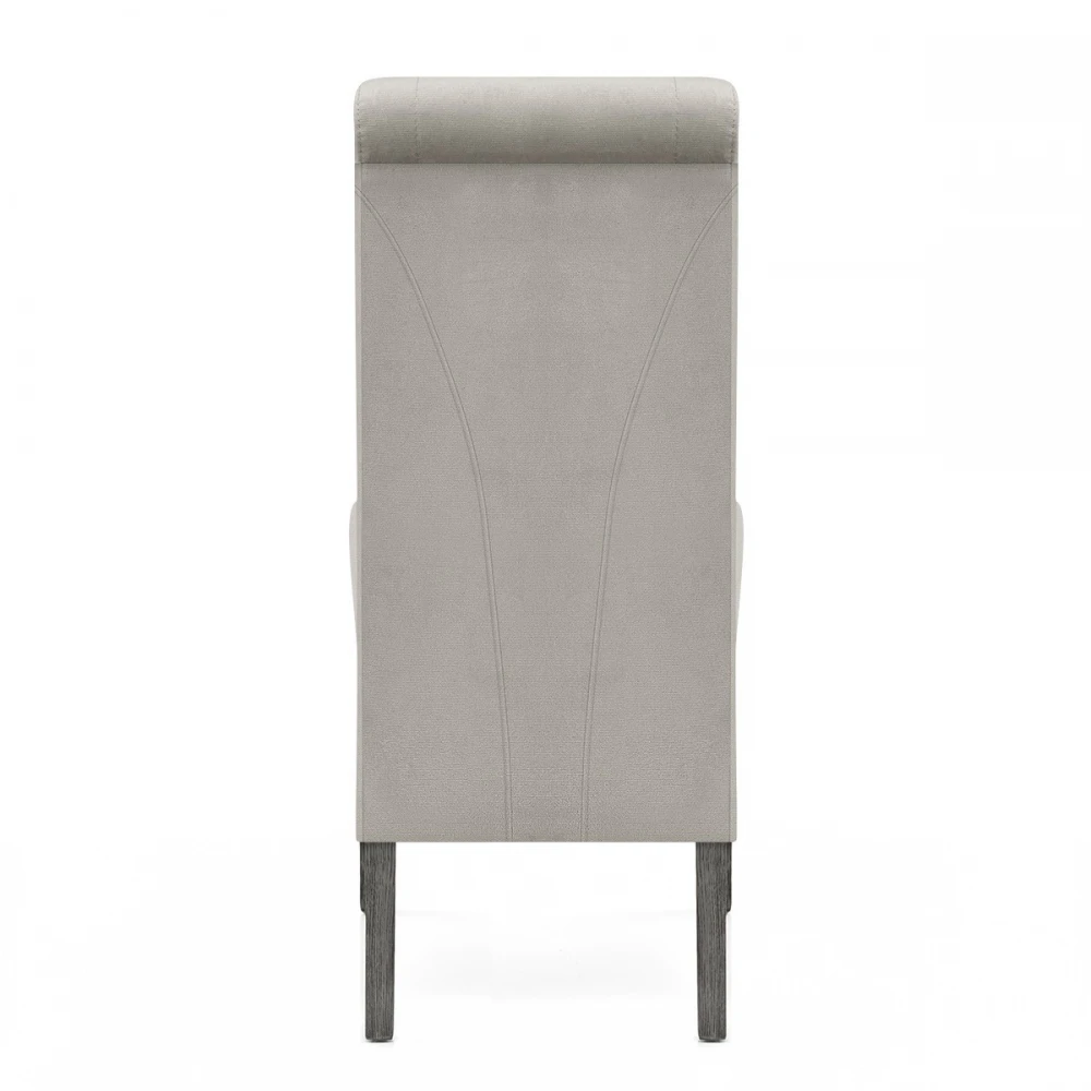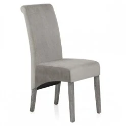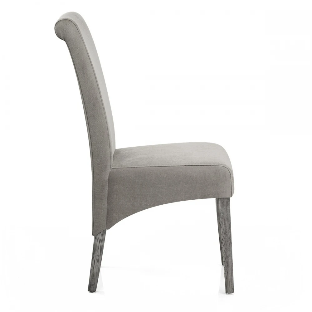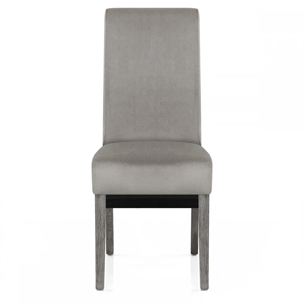 Der Esszimmerstuhl Carlo ist ein hervorragendes Modell, das eine beeindruckende Szene in Ihrem Essbereich schaffen wird. Der Sitz hat eine fantastische graue Samtpolsterung, um diesem klassischen Stück einen Hauch von Luxus zu verleihen. Eine hohe Rückenlehne bietet eine hervorragende Unterstützung und reicht bis über das Sitzpolster hinaus für eine auffällige Funktion. Der Rahmen besteht aus vier Beinen aus massiver Eiche und hat eine stabile Struktur mit einem eleganten Grau-Finish, passend zum Sitz. An der Unterseite jedes Beins sind Schutzstopfen angebracht, um die Bodenflächen zu schonen.