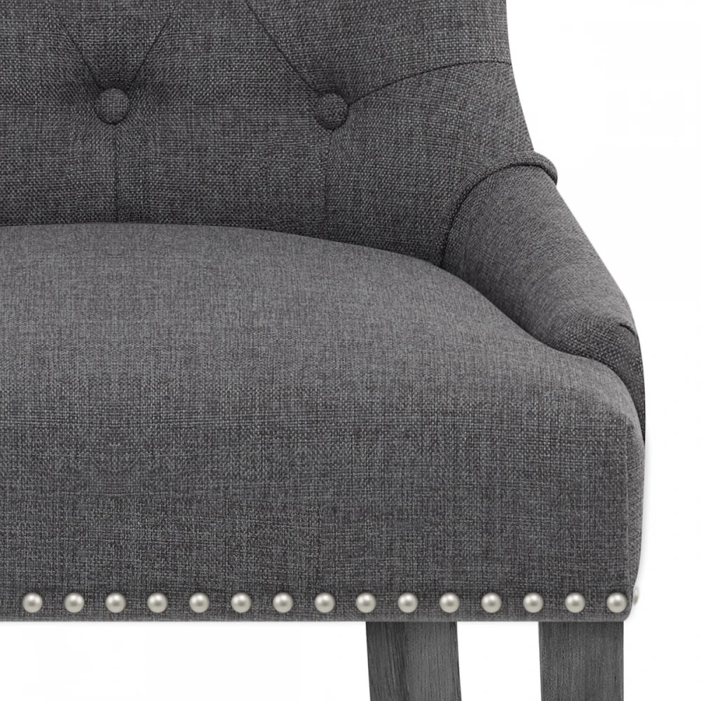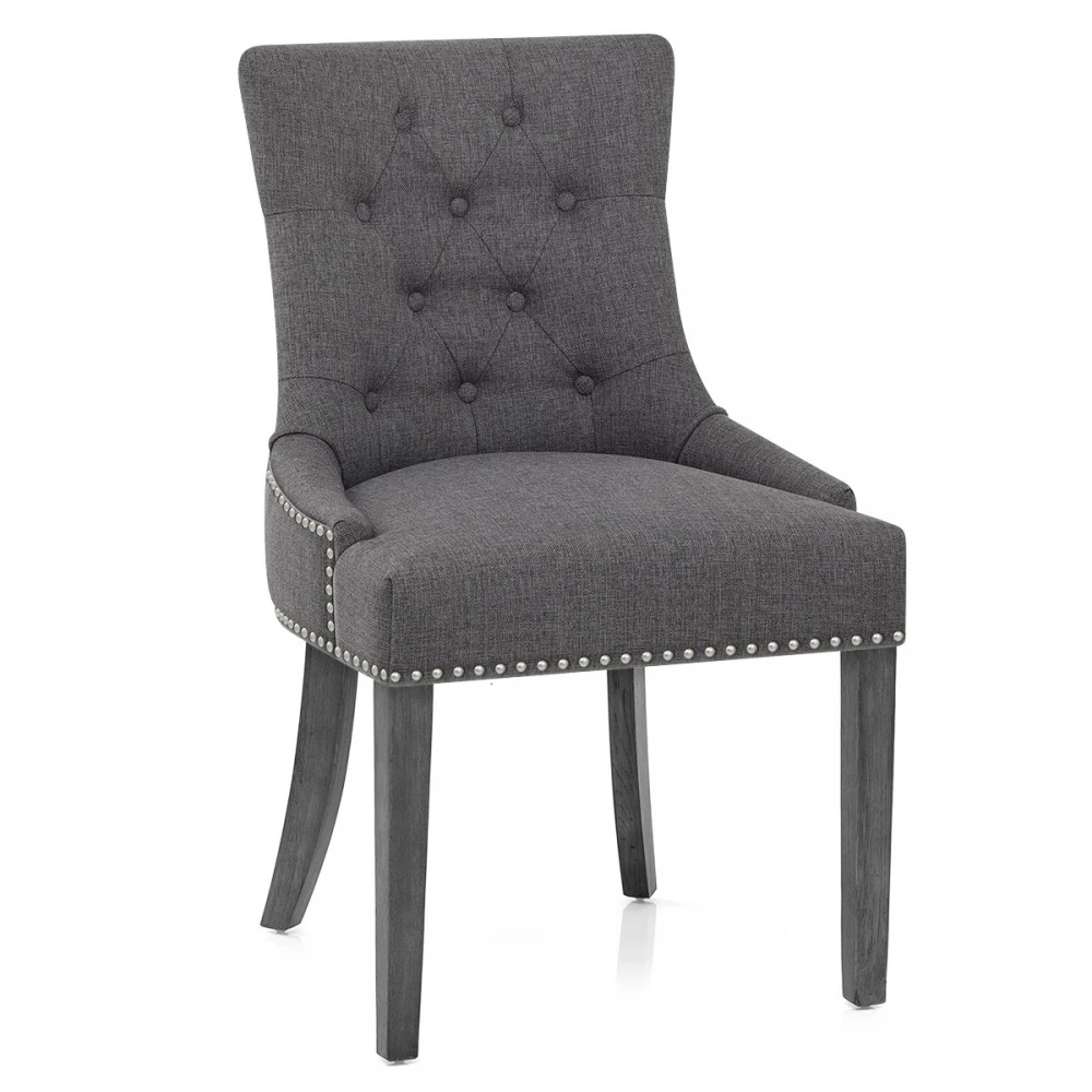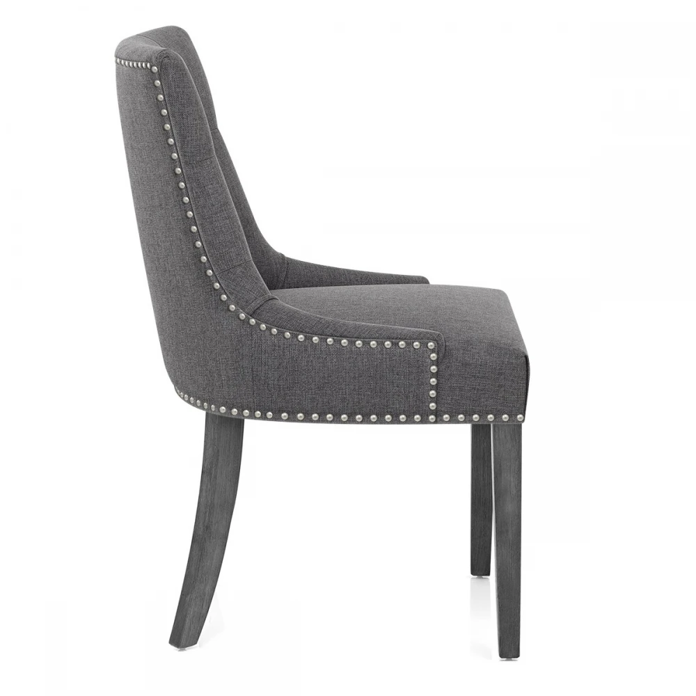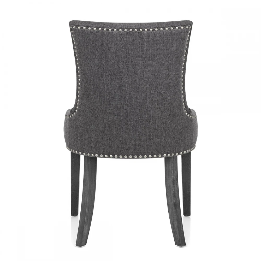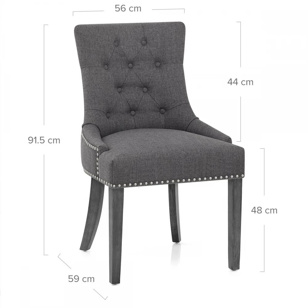 Holen Sie sich mit dem Etienne Esszimmerstuhl einen Hauch von zeitgemäßer Eleganz in Ihrem Heim. Der dunkle Stoff bedeckt den Sitz für Stil und Komfort und wird durch einen gefederten und gegurteten Rahmen verstärkt. Klassisch dekoriert mit gestepptem Knopfdetail und Knopfleiste umgibt die hohe Rückenlehne den Sitz für zusätzliche Unterstützung. Die soliden Holzbeine sorgen für Stärke und Robustheit und haben ein kühles graues Finish passend zum Sitz. Schutzgummistopfen sind auch unterhalb der Beine enthalten, um das Risiko von Schäden an Ihrem Boden zu reduzieren.