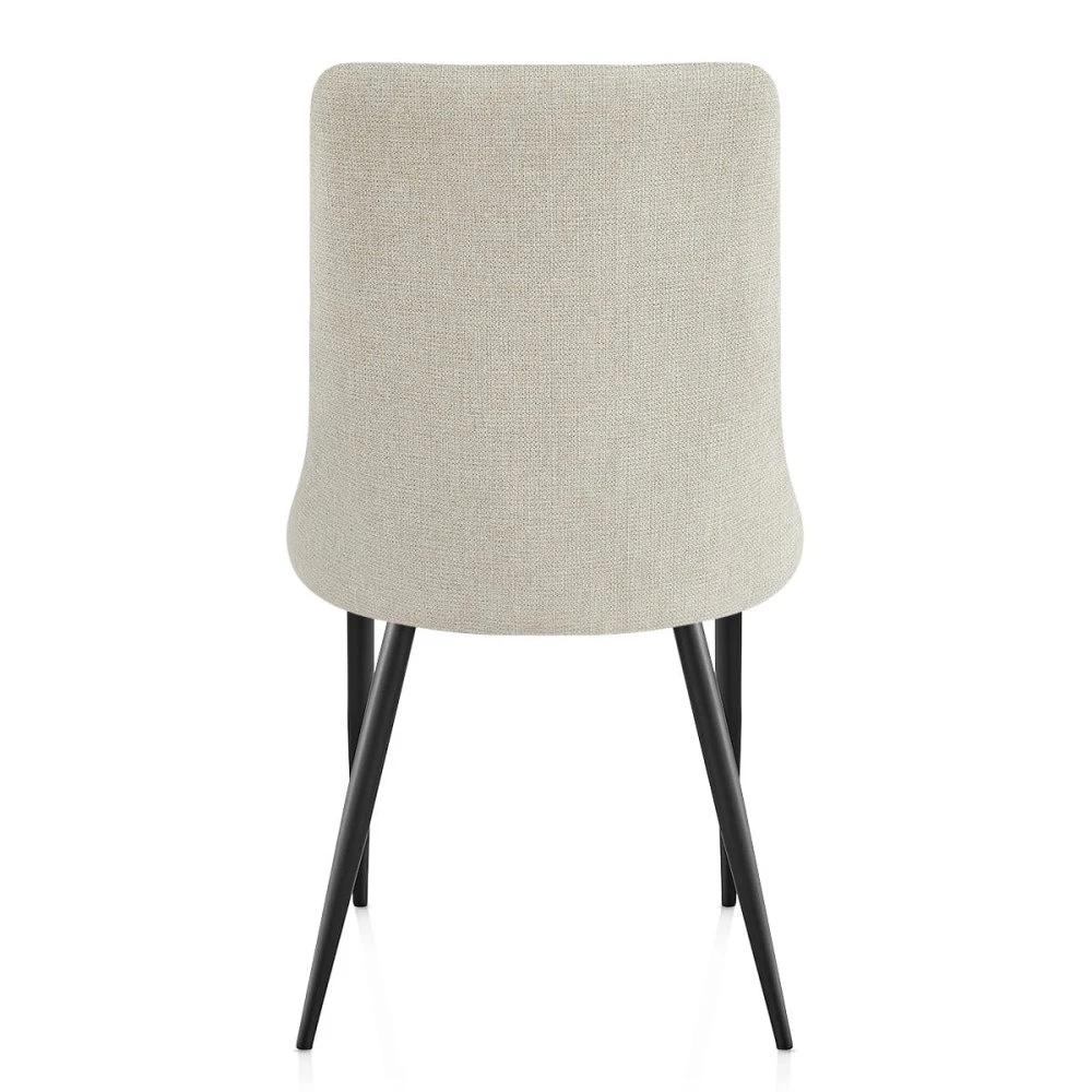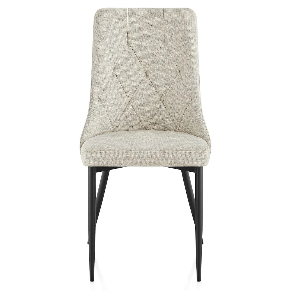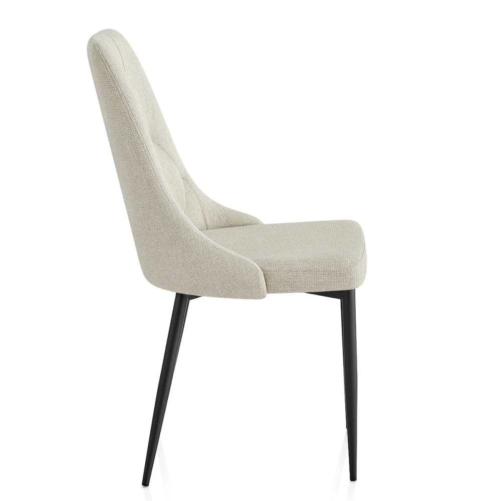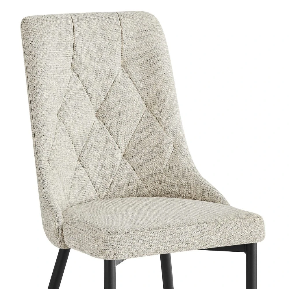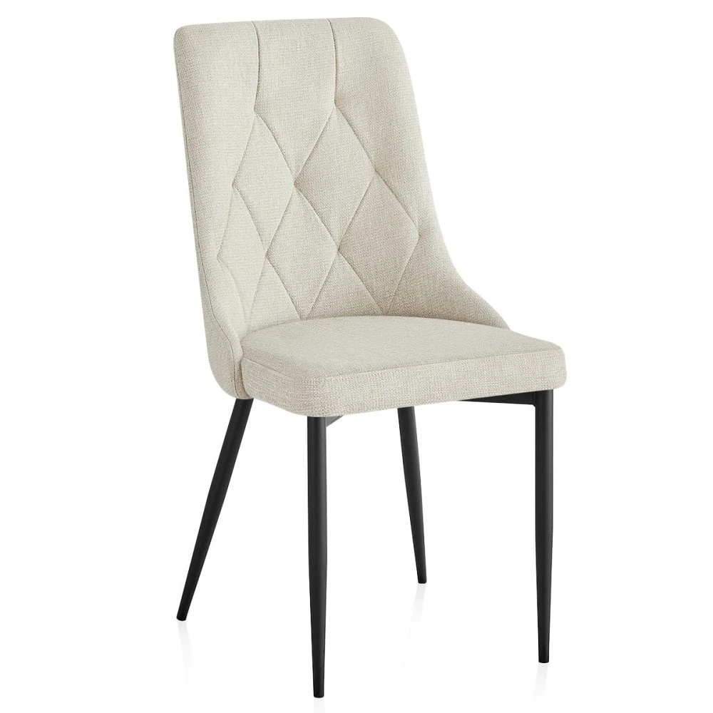 Der Phoebe Esszimmerstuhl mit Stoffbezug kombiniert ausgefeilte Eleganz mit modernem Design, indem er bewährte Konzepte traditioneller Stühle aufgreift und verfeinert. Mit seinem großzügig gepolsterten Sitzpolster und der hohen Rückenlehne bietet dieser Stuhl nicht nur außergewöhnlichen Komfort, sondern auch ein beruhigendes Sitzgefühl. Die Rückenlehne ist sanft nach unten gewölbt und umschließt die Sitzfläche teilweise, wodurch bequeme Seiten entstehen. Neben der Bequemlichkeit setzt der Stuhl auch auf visuelle Raffinesse: Die Rückenlehne ist mit stilvollen Rautenstichen verziert, die einen edlen Akzent setzen. Der Stuhl steht auf vier Metallbeinen mit schwarzer Pulverbeschichtung, die einen ansprechenden Kontrast zur hellen Sitzfläche bieten. Die Beine verjüngen sich nach unten hin und tragen zur raffinierten Ästhetik des Stuhls bei. Um Ihre Böden vor Abdrücken zu schützen, ist jedes Bein mit einem Fußbodenschoner versehen.