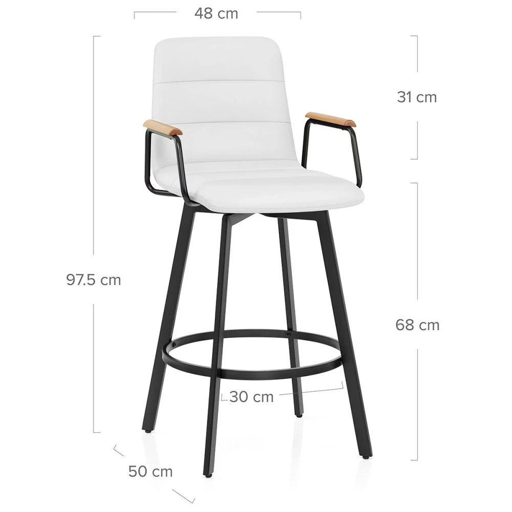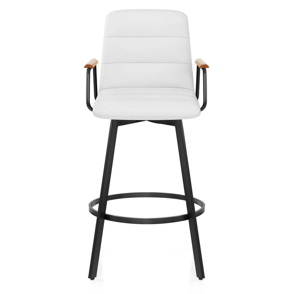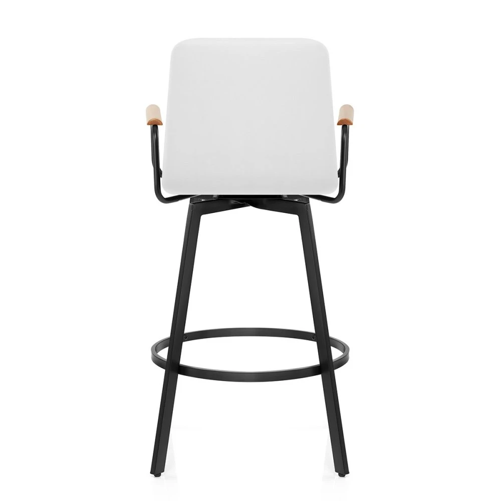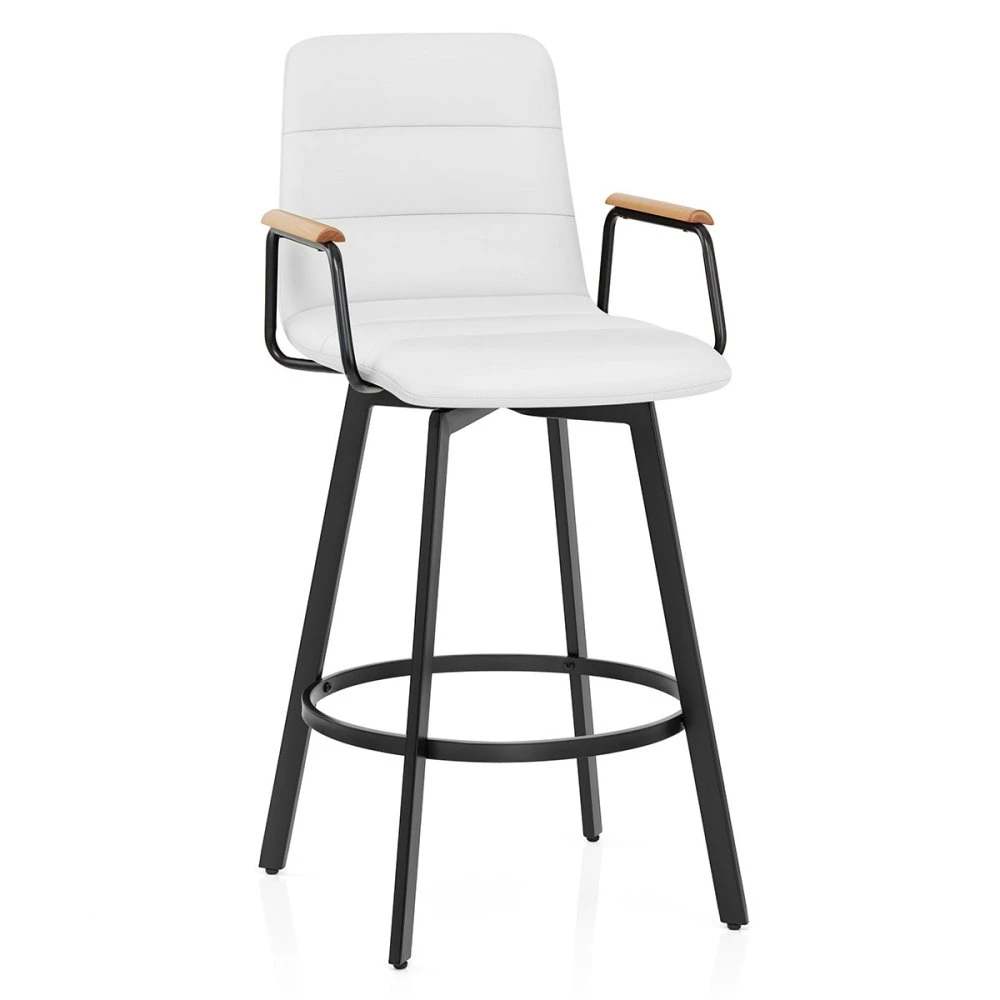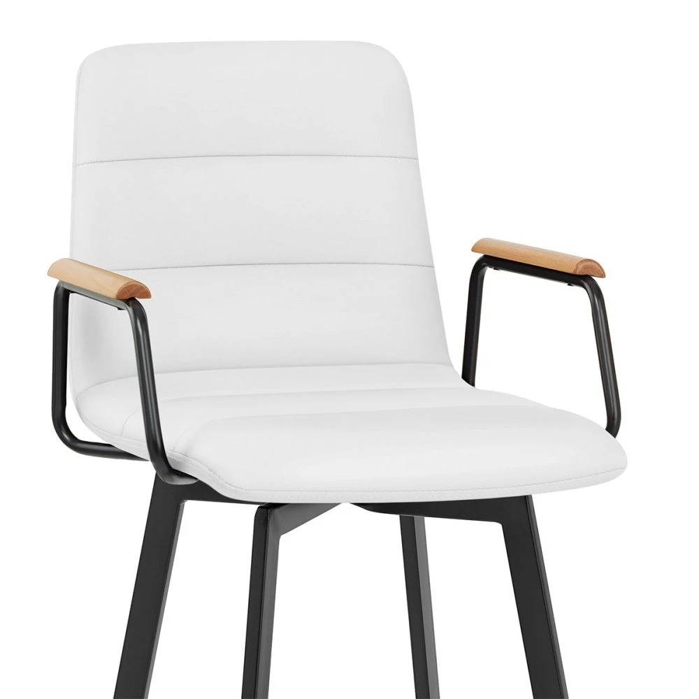 Der Marco Barhocker ist ein außergewöhnliches Möbelstück, das traditionelle und moderne Designelemente nahtlos miteinander vereint. Inspiriert von einem Sessel, verleiht er jedem Raum einen Hauch von Raffinesse und Eleganz. Der L-förmige Sitz wurde mit Blick auf Komfort und Stil entworfen und ist mit Kunstleder gepolstert, was die Pflege erleichtert, und ein angenehmes Sitzgefühl vermittelt. Die mit Schaumstoff gefüllte Rückenlehne ist hoch und hat zwei schwarze, mit Eichenholz versehene Armlehnen, die einen hervorragenden Halt bieten. Drei Segmente auf der Innenseite der Rückenlehne und des Polsters sind durch horizontale Nähte voneinander getrennt und sorgen für ein ästhetisches Gesamtbild. Eine 360-Grad-Drehplatte ermöglicht es dem Benutzer, sich problemlos in jede Richtung zu drehen. Das Gestell ist mit einer eleganten schwarzen Pulverbeschichtung versehen und wird von vier stabilen, rechteckigen Stützen getragen. Eine kreisförmige, quadratische Fußstütze verstrebt die Innenseite des Gestells und bietet dem Benutzer einen bequemen und komfortablen Platz für die Füße. Um den Boden nicht zu beschädigen, ist jedes Bein mit Schutzpads versehen.