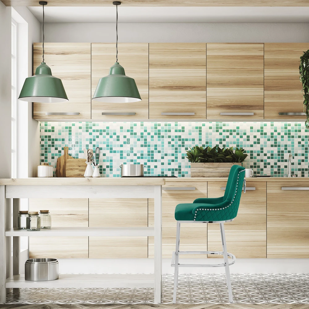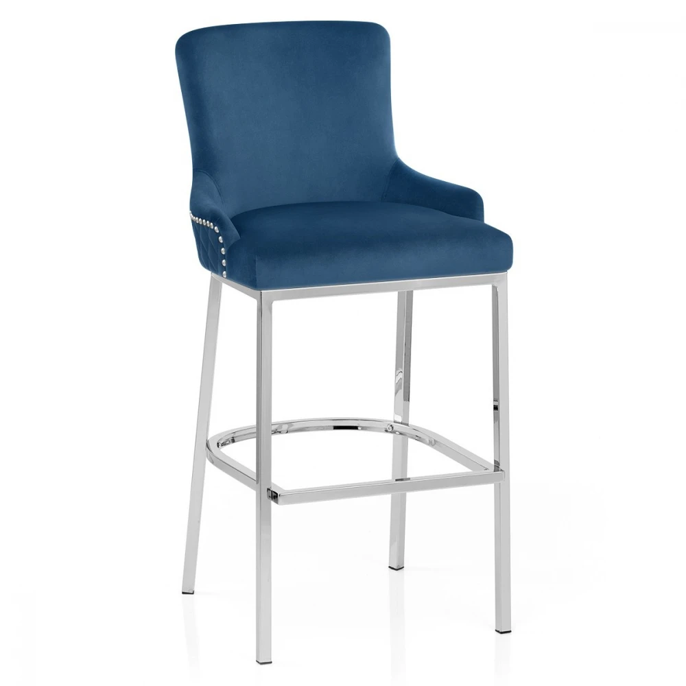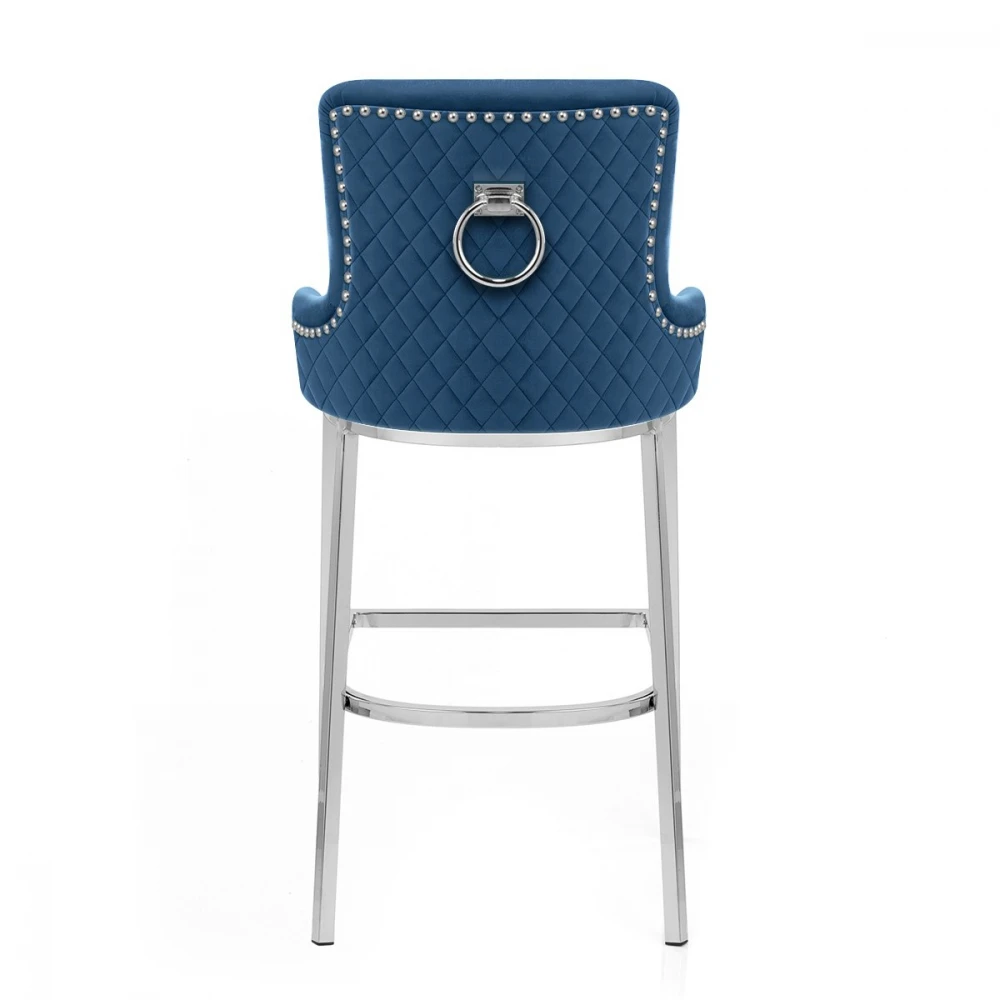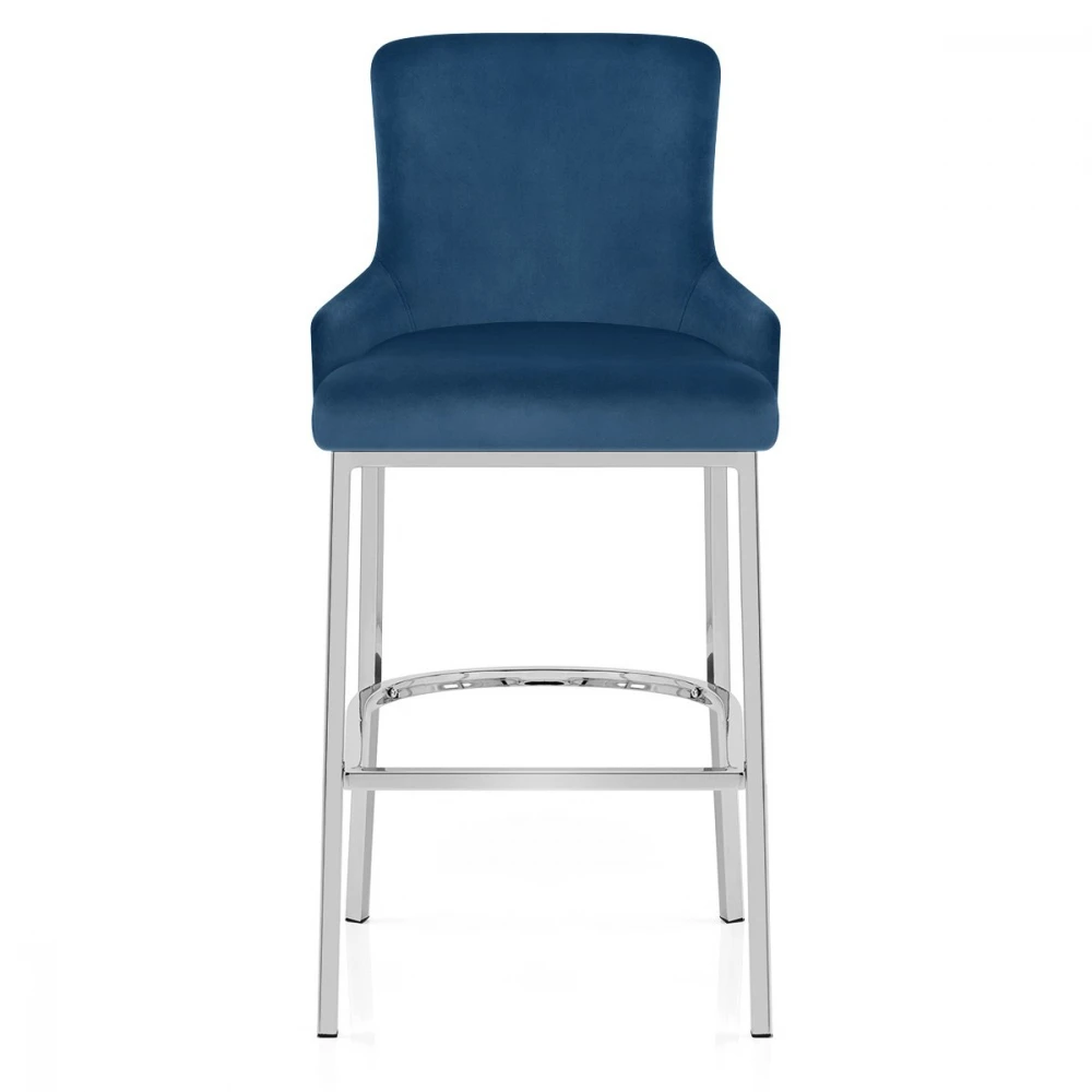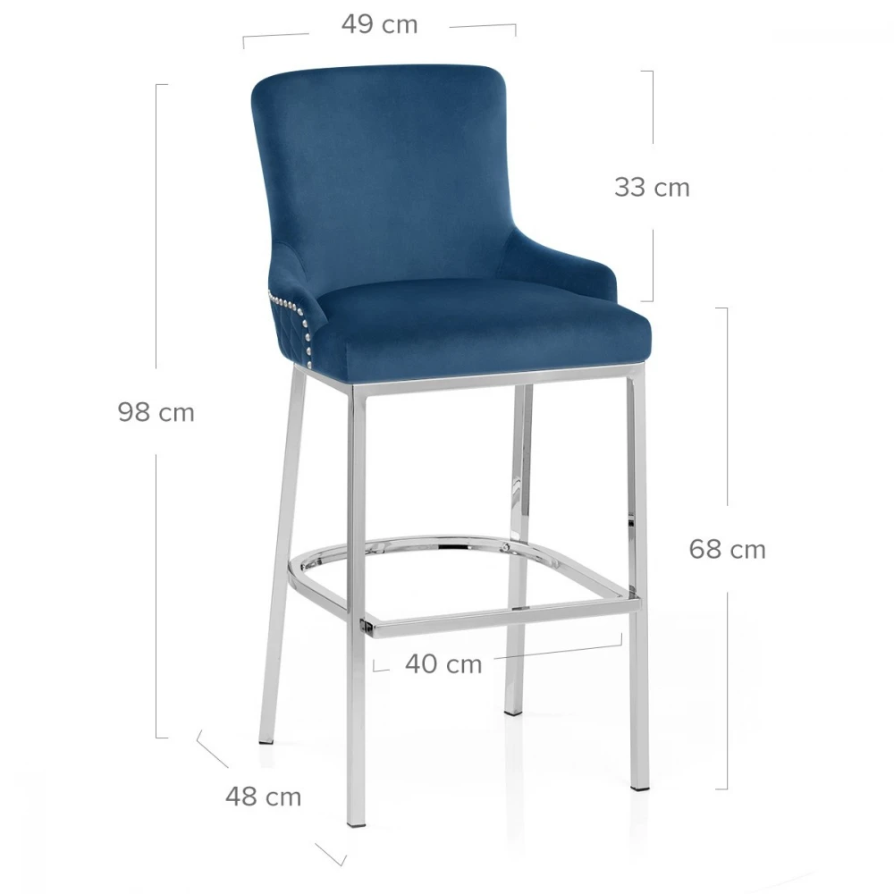 Unser Blush ist eine aufwendig gestaltete Alternative für Sie, wenn Ihrer Küche ein gemütlicher Charme verliehen werden soll. Denn er verführt durch einen hochwertigen und bequemen Samtbezug und rundet dies durch ein opulentes, aber einladendes Äußeres ab. Die hohe Rückenlehne bietet zusätzlichen Komfort. Die vier Beine des Gestell dieses vollendeten Barhockers werden mit einem geschwungenen Fußstützenteil miteinander verbunden. Das gesamte Gestell besteht aus poliertem Chrom und erhöht durch den edlen Glanz die gesamte Optik des Blush. Schutzstopfen sind zum Schutz Ihrer Bodenfläche unter allen Beinen angebracht.