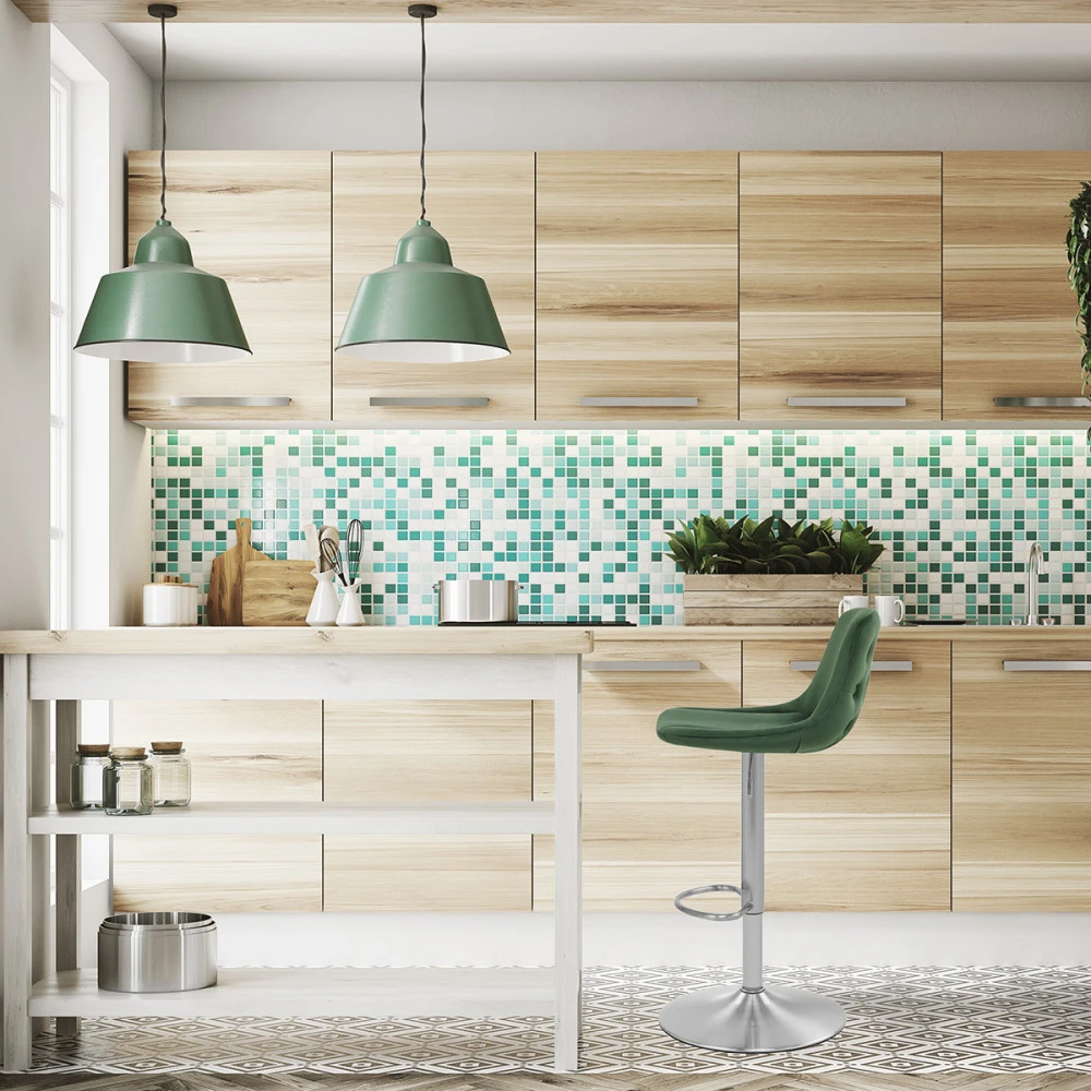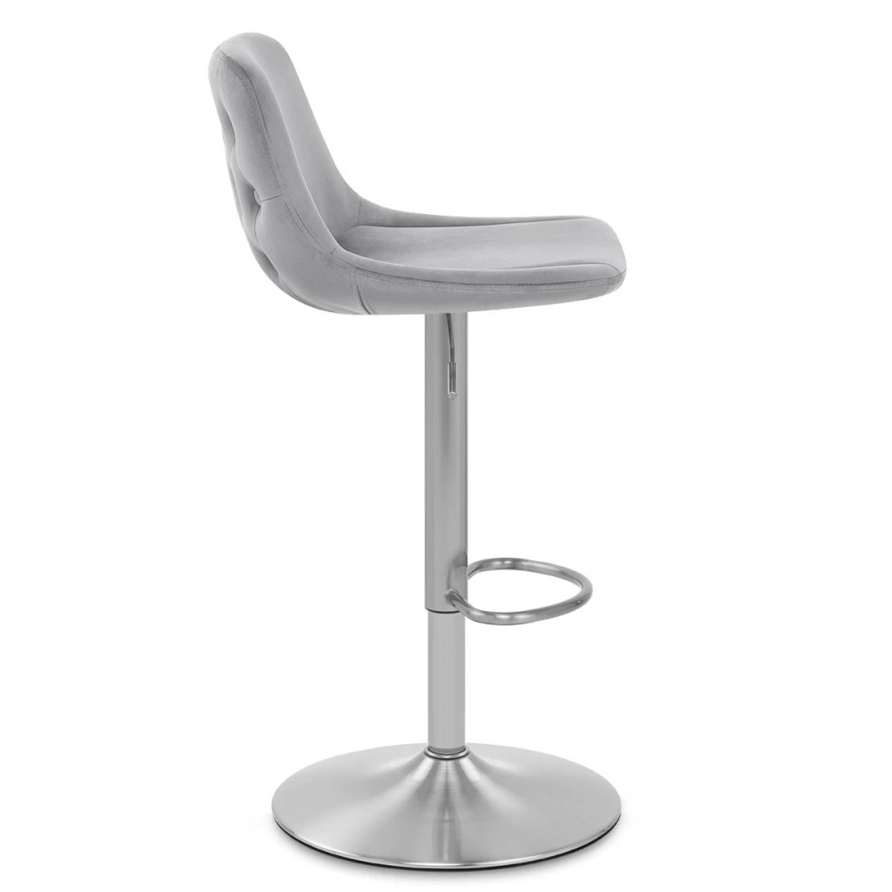 Der Samtbarhocker Scoop ist ein moderner Hocker mit traditionellen Details. Die Samtpolsterung präsentiert eine Raffinesse, die auf der Rückseite der mittelhohen Rückenlehne betont wird. Das geknöpfte Detail konturiert die Rückseite des Sitzes und verleiht dem Hocker die Dekoration, die Ihren Blick auf sich zieht. Eine atemberaubende Säule aus gebürstetem Stahl trägt den Sitz, einschließlich eines Gashebemechanismus. Dies ermöglicht eine variable Höhe und eine 360-Grad-Schwenkbewegung, sodass der Hocker an Ihrer Bar leicht zugänglich ist. Eine passende Fußstütze ist am Rahmen oberhalb der kreisförmigen Basis angebracht. Unter der Basis befindet sich ein Schutzring, um Schäden an Ihren Böden zu vermeiden.