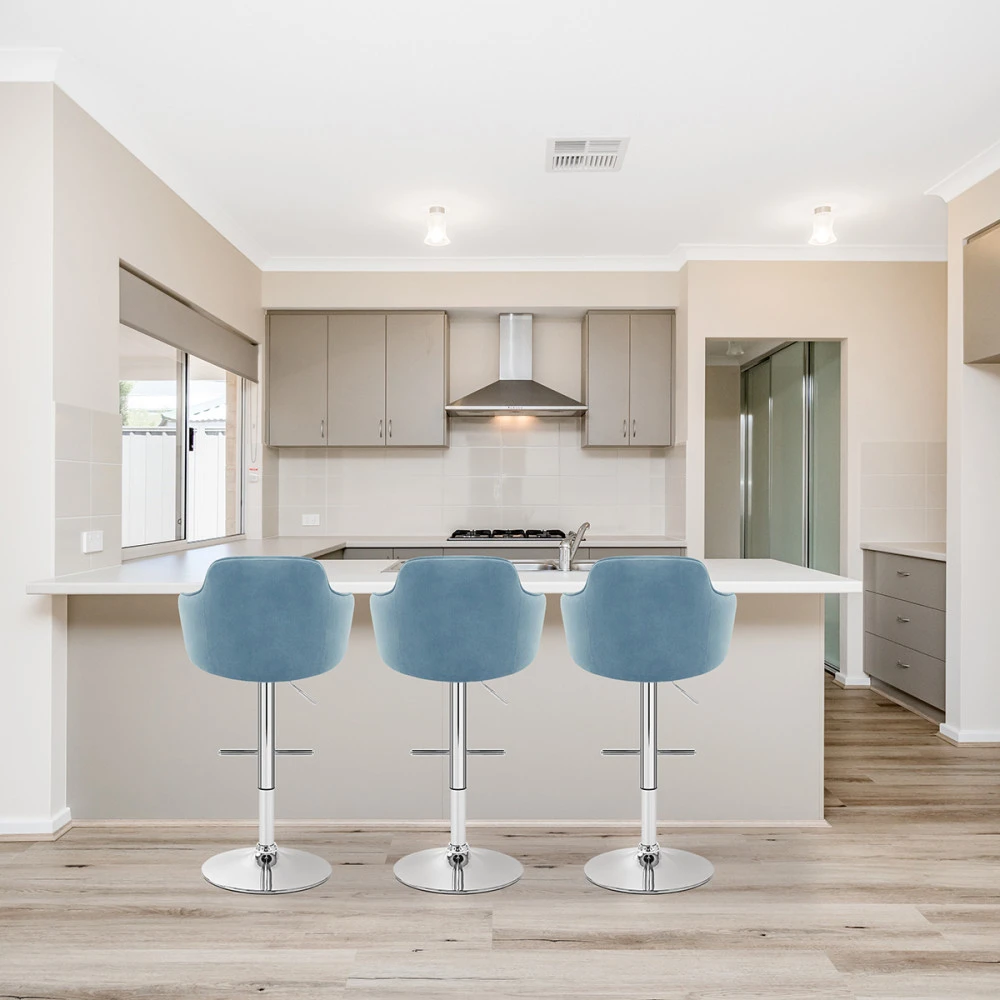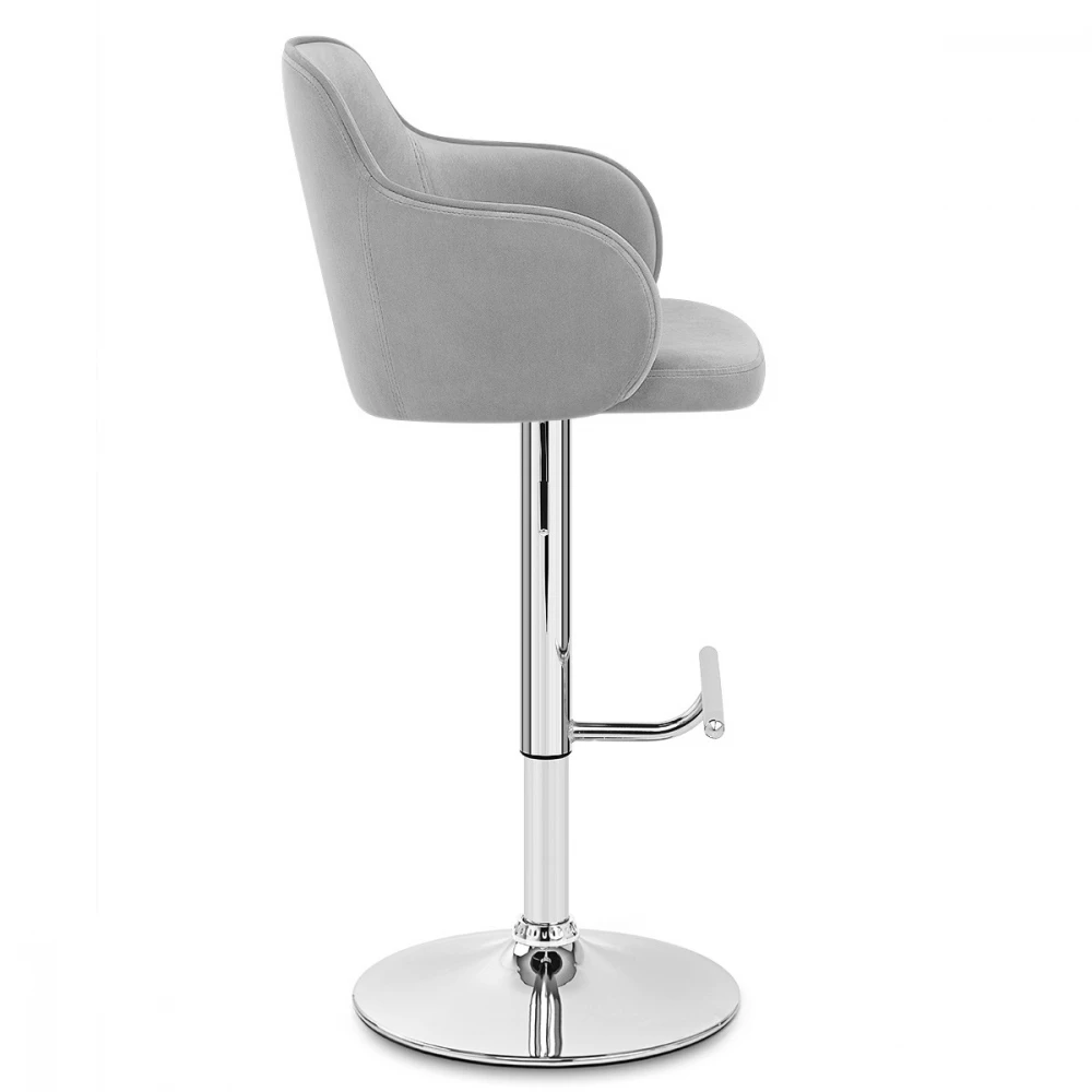 Erstellen Sie mit dem Vista Barhocker, einem einfachen, aber liebenswerten Möbelstück, einen perfekten Barbereich. Der bequeme Sitz ist mit einer einzigen zentralen Maschenlinie in der hohen Rückenlehne ausgestattet. Das umlaufende Design des Rückens bildet zwei Stützarme, die ein stuhlähnliches Erlebnis bieten. Mit Samt bezogen, ist dies ein edles Design. Ein verspiegelter Chromrahmen befindet sich unter dem Sitz und umfasst einen Gashebemechanismus für die Höhenverstellung und eine 360-Grad-Drehung. Die t-förmige Fußstütze ist eine stilvolle Komponente und wird von einer robusten runden Basis mit einem schützenden Bodenschutz begleitet.