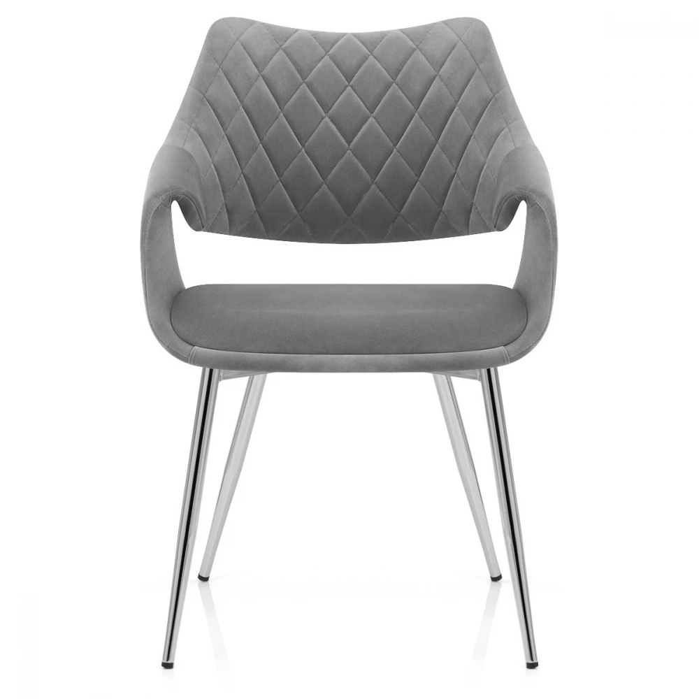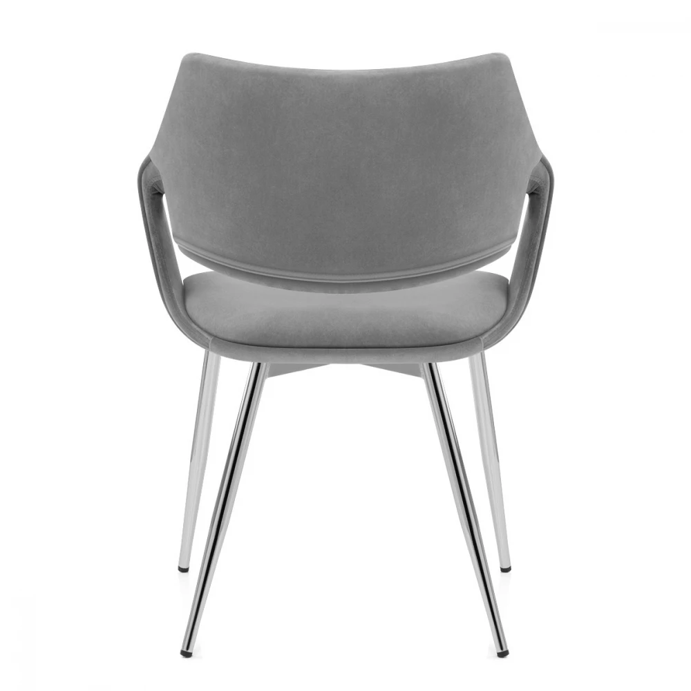 Die harmonische Kombination von Texturen bringt eine bemerkliche Präsenz in Ihrer Küche oder Esszimmer. Die schlichte Sitzfläsche ist mit der genähten Rückenlehne durch die eingerollten Armlehnen verbunden. Das offene Segment betont die einzigartige Form vom Stuhl und die Bugholzplatte der Sitzfläsche ergänzt den Samt Esszimmerstuhl hervorragend. Die vier verchromte Beine unterstützend zum Stuhl verfeinern sich in Boden Höhe und sind mit einen Schutzpolster ausgestattet um Kratzer auf Ihre Böden zu vermeiden.