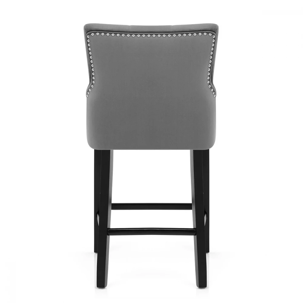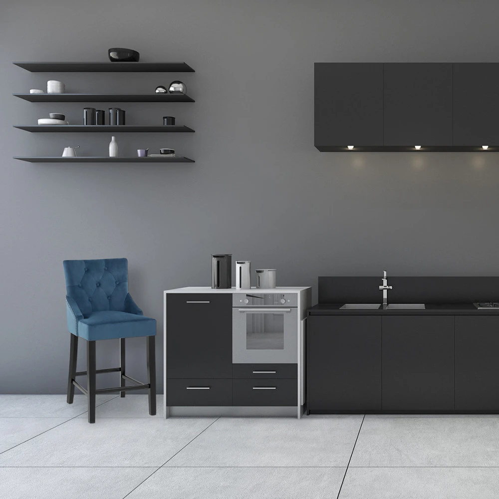 Beeindruckend durch seiner Erscheinung ist der Samtstoff Barhocker Loxley für jedem Barbereich geeignet. Der dicht gepolsterete Sitz mit Samtstoff schlicht bezogen ist von der Rücklehne seitlich umringt und bietet excellenten Halt und Gemütlichkeit. Sorgend für einen zusätlichen Hauch von Klasse, die Knöpfe an der Rückenlehne sowie die verchromte Nieten die den Sitz entlang laufen. Der vier beinige Gestell ist aus robusten schwarzen Wenge Holz erstellt. Die Querstreben dienen als Fuβstütze und unter jedem Fuss befindet sich einen Schutzpolster um ihren Böden von Kratzer zu beschützen.