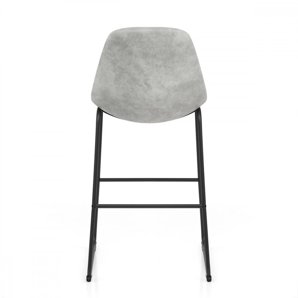 Die ausdrucksvolle Retro-Sitzfläche des Platina Barhockers wird mit einem trendigen, minimalistischen Gestell kombiniert, wodurch ein charakteristisches Stück entsteht, das gleichzeitig robust, stilvoll und erschwinglich ist. Ein Bezug aus antikem Wildlederimitat verleiht dem Hocker eine Vintage-Ästhetik, die durch horizontale Linien von Ziernähten sowohl auf dem Sitzpolster als auch auf der hohen Rückenlehne ergänzt wird. Die geschwungenen Metallbeine sind stabil konstruiert und mit einer schwarzen, matten Pulverbeschichtung ausgestattet. Zusätzliche Stäbe befinden sich an der Vorder- und Rückseite des Gestells, von denen der erste als stützende Fußstütze dient. An der Basis des Hockers sind Bodenstopfen angebracht, um Spuren und Kratzer zu vermeiden.
